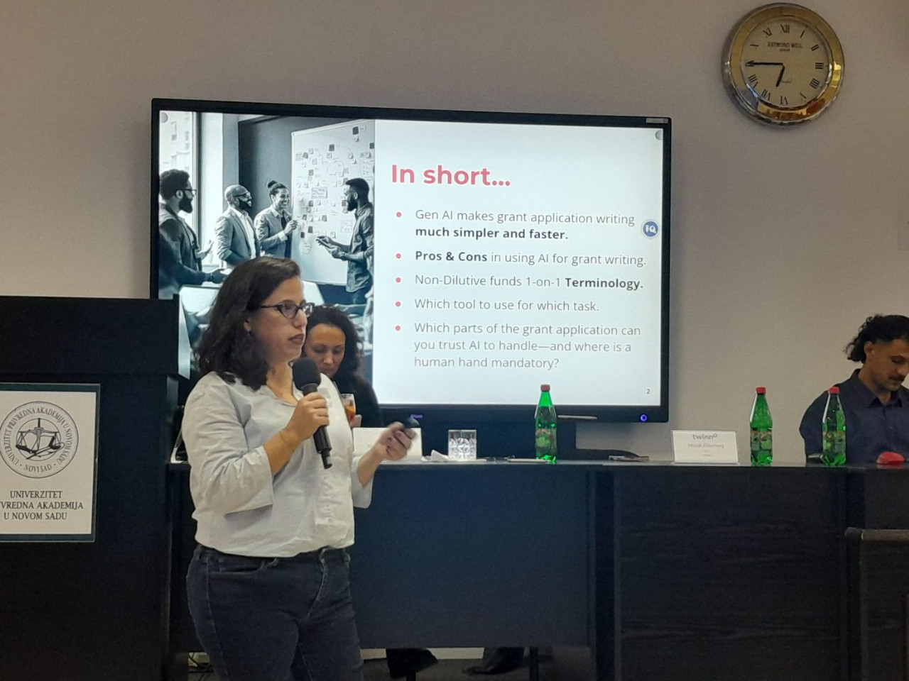 Prvo predavanje održala je Michal Zilberberg, izvršni direktor Twinnovation, ekspertkinja za strategiju EU finansiranja sa više od 10 godina iskustva i bivša savetnica u Evropskom parlamentu održala je predavanje na temu: „Kako koristiti AI alate za izradu projektnih predloga?“. Kroz ovo interesantno predavanje prisutni su imali priliku da saznaju na koji način upotreba veštačke inteligencije može da doprinese unapređenju mogućnosti bespovratnog finansiranja istraživača i preduzetnika iz EU fondova.