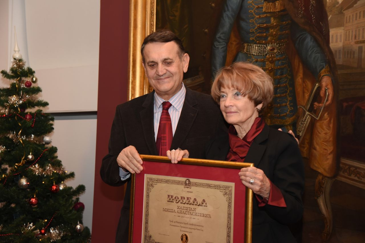 Profesor emeritus i predsednica Saveta Univerziteta Privredna akademija u Novom Sadu prof. dr Marijana Carić dobitnica je priznanja za životno delo koje je dodelio predsednik žirija prof. dr Radovan Pejanović, bivši rektor Univerziteta u Novom Sadu.