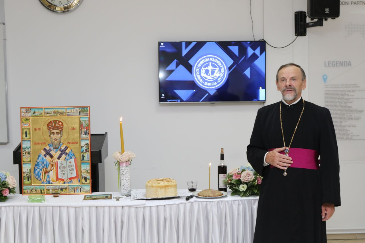 ,,Da znanje i vera ne isključuje jedno drugo svedoči sveštenomučenik Sava, koji je služeći u Crkvi studirao i diplomirao na Pravnom fakultetu u Beogradu i položio sudijski ispit. Ustanovljavanje slave Univerziteta Privredna akademija u Novom Sadu izraz je, ne samo nastavljanja i negovanja duboke tradicije našeg naroda, već prevashodno svest i potreba za duhovnim pokroviteljstvom onih koji poučavaju i onih koji uče u ovoj instituciji’’. – istakao je rektor Univerziteta prof. dr Marko Carić.