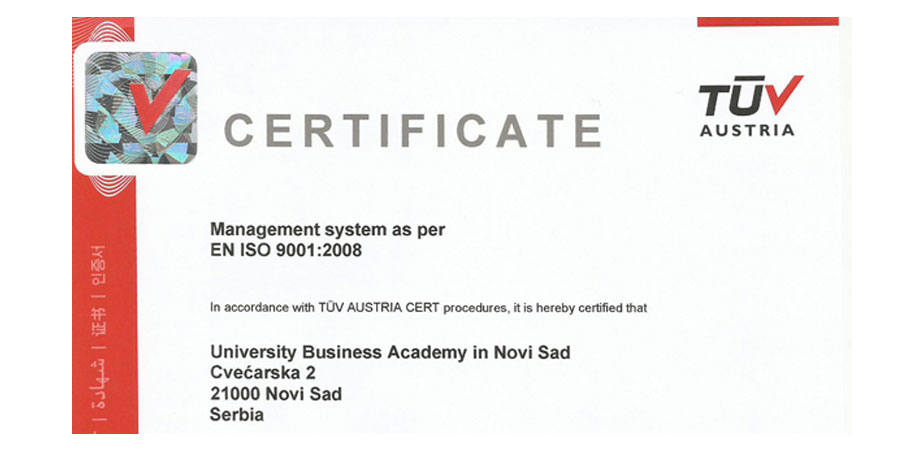 Univerzitetu Privredna akademija u Novom Sadu uručen je sertifikat sertifikacione kuće TÜV AUSTRIA CERT iz Beča, koji potvrđuje da je sistem kvaliteta Univerziteta, za delatnost pružanje obrazovnih usluga i naučno istraživanje u oblasti visokog obrazovanja, usklađen sa zahtevima međunarodnog standarda ISO 9001:2008.