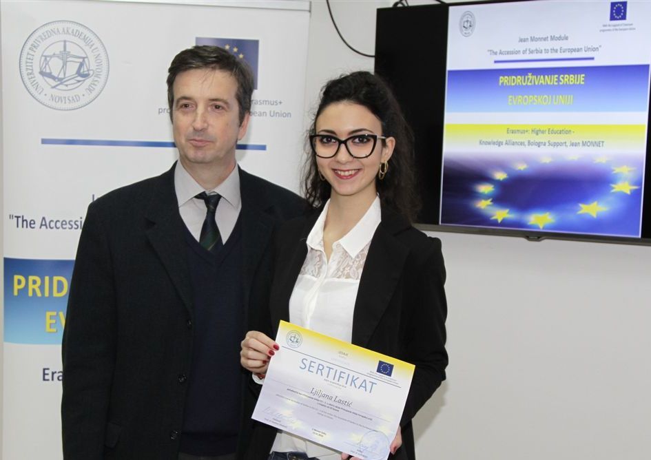 On 25 February 2016, the University Business Academy in Novi Sad organized a celebratory event of placing and uncovering a plaque honoring the Jean Monnet Module with an accompanying award of certificates to all attendees of the lectures held so far within the framework of the Jean Monnet Module "The Accession of Serbia to the European Union".