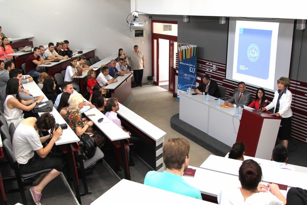 In the new study hall of the University Business Academy in Novi Sad on May 12, 2015, the Ambassador of France to the Republic of Serbia, Her Excellency Mrs. Christine Moro, delivered a lecture for students of the Faculty of Economics and Engineering Management and Faculty of Law for Commerce and Judiciary. The lecture was entitled "Values of the European Union".